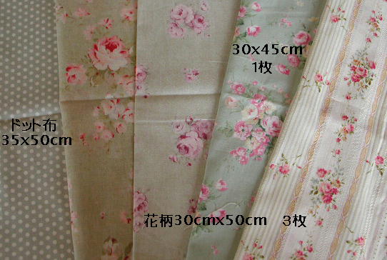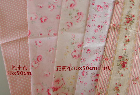 | カットクロス5枚組 ピンクA Cut-2 ¥1080 リーフマットのレシピ付 キルト芯は入ってません.. 花柄布30x54cm 4枚 ドット布35x54cm 1枚 |