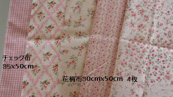 | カットクロス5枚組 ピンクC Cut-5 ¥1000 リーフマットのレシピ付 キルト芯は入ってません.. 花柄布30x54cm 4枚 チェック布35x54cm 1枚 |