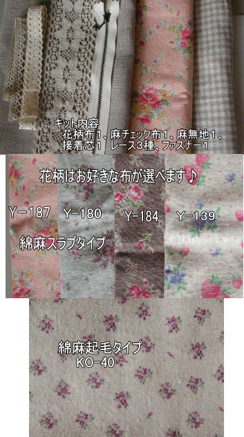 Sweetケースキット 綿麻スラブタイプ キット価格¥2250 +送料 (メール便200またはミニ宅配便440) お好みの布をお知らせください. Y-78モスベージュ Y-187ピンク Y-180グレーミント Y-184茶 Y-139ストロベリー Sweetケースキット 綿麻起毛小花 KO−40タイプ キット価格¥2200 +送料 (メール便200またはミニ宅配便440) アメリカンホック15mm1セットはご用意ください. うち具が必要なためキットには入ってません. |