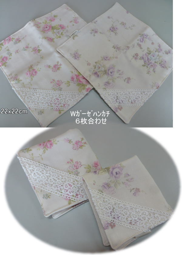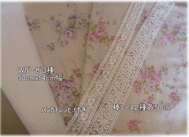 | Wガーゼ&レース セット ¥1180 ハンカチレシピ付き 4枚作れます. オフホワイトのwガーゼを間にはさんで作りますので しっかりしたハンカチが出来ます. |