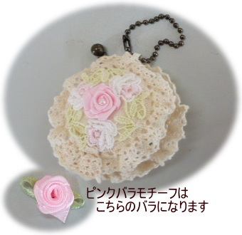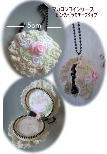 | マカロンコインケースキット ピンクタイプ \580+送料 型紙、レシピ、くるみボタンプラ4cm2個、布2種、キルト綿、 ファスナー、ボールチェーン、サテンリボン、テープ、 パステルケミカルレース、ギャザートーションレース、バラモチーフ2個 |