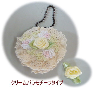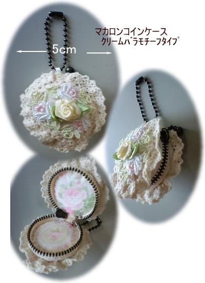 マカロンコインケース クリームタイプ ¥580+送料 型紙、レシピ、くるみボタンプラ4cm2個、布2種、キルト綿、 ファスナー、ボールチェーン、サテンリボン、テープ、 パステルケミカルレース、ギャザートーションレース、バラモチーフ2個 |