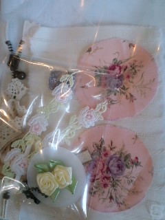 | 入ってる材料 レース類 14枚 布3種、 接着芯 ¥2350+送料(メール便200) この材料で サシェカバー2枚と 残りの布でミニクッションが数点作れます. 布やレースは余りますのでミニクッション等にご使用下さい. フレッシュセンツ ジャスミン (定価¥493)を ご入り用の方は 1袋¥450でお分け致します♪ カットクロスご注文の際に、ご注文下さいね. |