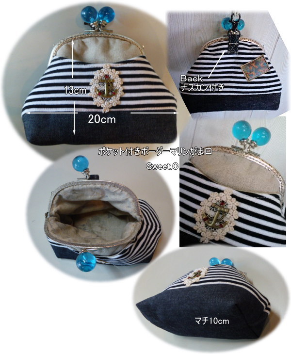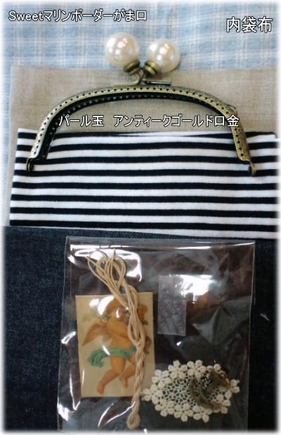 | Sweetマリンボーダーがま口キット パールタイプ ブルークリアタイプ 入ってる材料 型紙、レシピ(レースポケット付きがま口のレシピのアレンジバージョンです) 布4種、キルト綿、接着芯、紅茶染めモチーフレース、 イカリチャーム、、がま口金、口金用縫い糸(革用縫い糸) 革タグ1枚、ナスカンはプレゼントさせていただきます. |