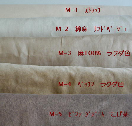 | M-1 綿95%ストレッチ クリーム色 110幅 ¥980/m (税込み\1029/m) M-2 綿35%麻65% サンドベージュ 110幅 ¥1080/m (税込み\1130/m) M-3 麻100% ラクダ色 153cm幅 ¥1350/m (税込み\1417/m) M-4 ベッチン ラクダ色 108cm幅 ¥1080/m 税込み\1130/m M-5 ビンテージデニム こげ茶 110cm幅 ¥1080/m 税込み\1130/m |