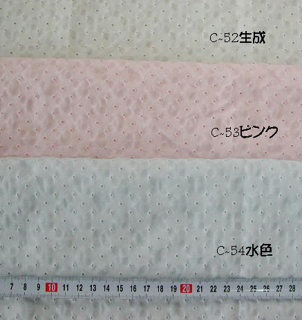 C-52 綿ローン 穴あきレース 108cm幅 2.生成 1m ¥1000 (税込¥1050) C-53 綿ローン 穴あきレース 102cm幅 3.ピンク C-54 綿ローン 穴あきレース 108cm幅 4.水色 1m ¥1000 (税込¥1050) |