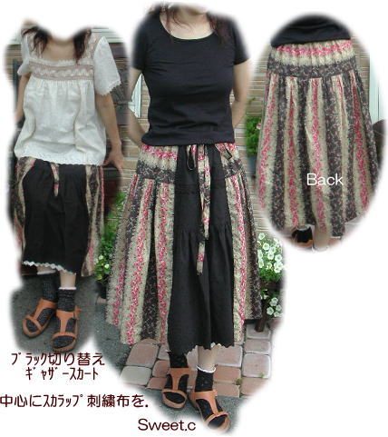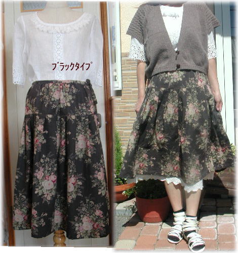 コットンスカラップ刺繍布と光沢とはりのある素敵なバラ柄布でスカートを作りました..![]()