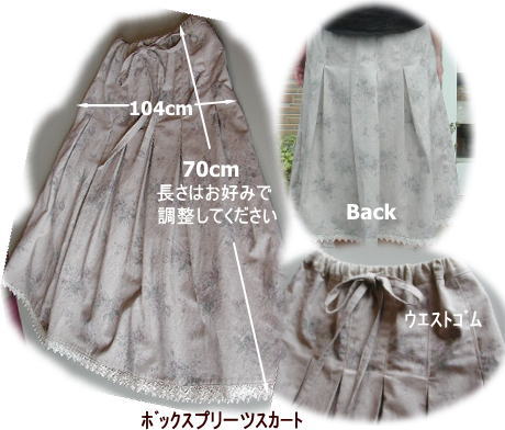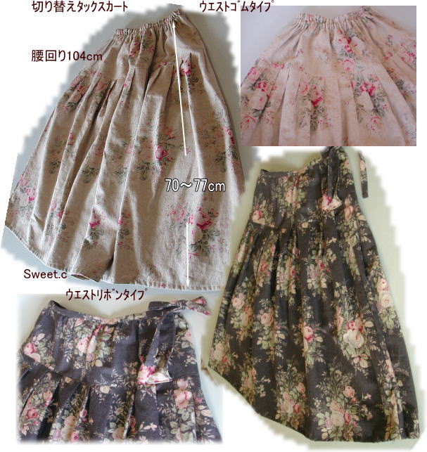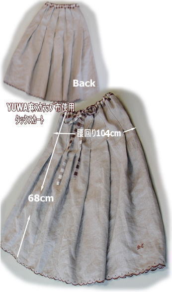 | 切り替えタックックスカートキット価格¥3400+送料 メール便¥200又はミニ宅配便¥440のどちらかお選び下さい お好みの布をお知らせ下さい 綿麻ベージュタイプ 在庫 3セット 綿麻ブラックタイプ ゴムウエスト(2本ゴム)&ウエストリボンタイプの2種がレシピに書いてます. お好みの方で製作して下さい. 丈も最高77cmの長さに出来ます. ウエストリボンタイプの場合スナップボタン又はカギホックをご用意下さい 入ってる材料 布、ウエスト用ゴム、レシピ |