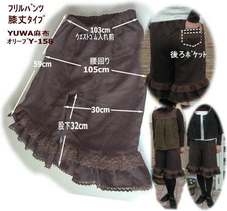 | Sweetフリル膝丈パンツ 1サイズのみです. 布の変更は可能です..別途お見積もりを差し上げます YUWA麻ブラック、カーキでもキット組可能です 布幅が140cmですので布に余裕がありません 注意して裁ってください 型紙はA3サイズコピー用紙です 股下42cmサイズも記入してます. (実物大型紙7枚 張り合わせて作って頂きます+作り方説明書付き) キット価格 ¥3790+送料 オリーブY-158Y-158タイプ カーキY-149はキット組可能です. メール便¥200又はミニ宅配便¥440のどちらかお選び下さい キット内容 YUWA麻100%布゙140cm幅x90cm(膝丈サイズ用の布) YUWA麻100%レース カーキオリーブ 2種 2.5cm幅ゴムテープ75cm 型紙&レシピ *股下42cm〜52cmサイズの場合 140cm幅x110cm になりキット価格は ¥4170になります オリーブ カーキ キット組可能です |