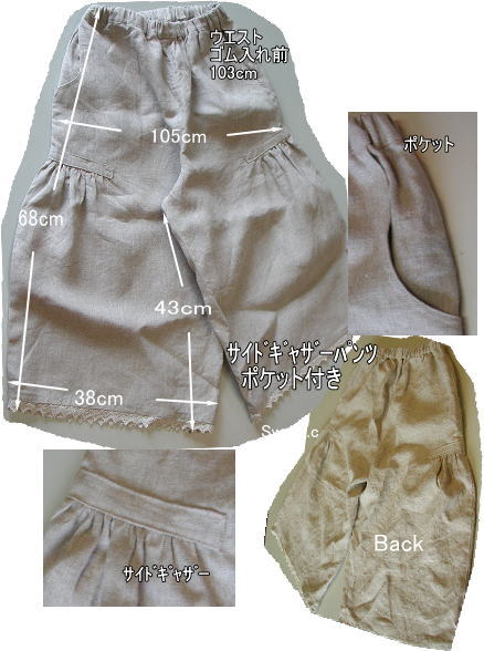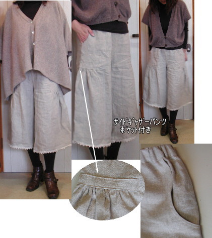 サイドギャザーパンツ ポケット付き キット価格¥4100 メール便¥200又はミニ宅配便¥440のどちらかお選び下さい 麻布Li−16 キット内容 型紙、レシピ 麻布1.6m 裾用トーションレース 接着芯 2.5cm幅ウエスト用ゴム 他の布でもキット組可能です |