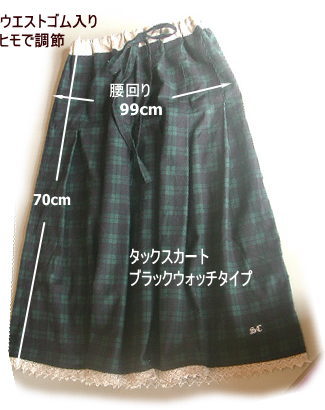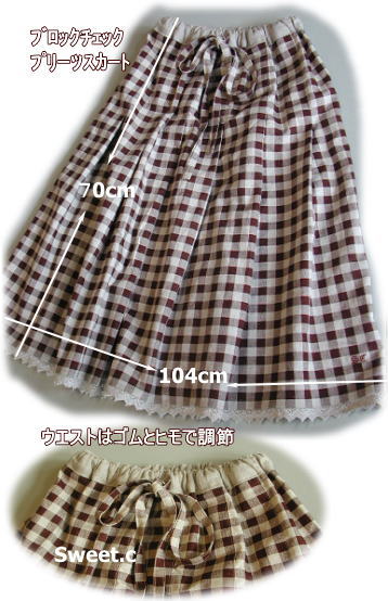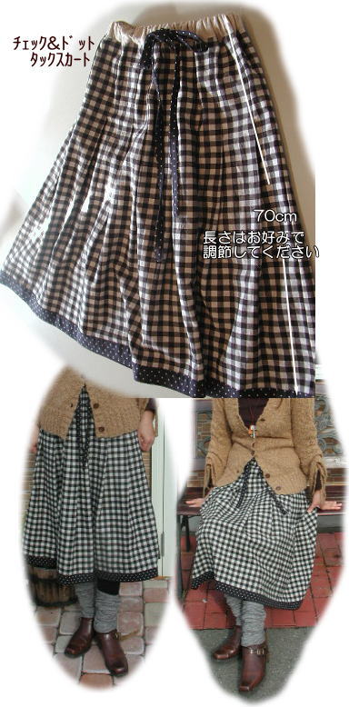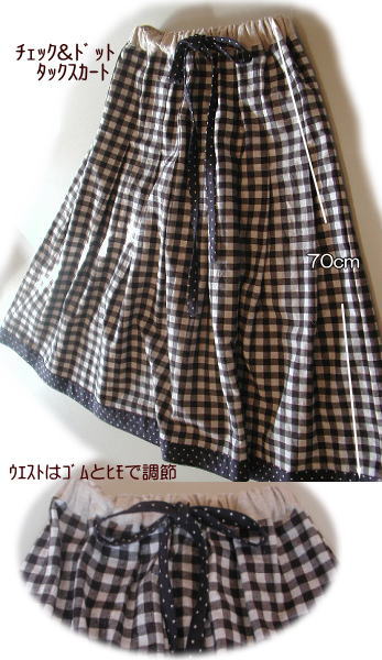 チェック/ドットタックスカート ブラックタイプC-119 キット価格¥2700+送料 裾がドット布になってます. レシピ1枚、 スカート布1.7m ベルト用麻布、 接着芯5x10cm 2.5cm幅ウエスト用ゴム75cm こちらは実物サイズの型紙はありません. サイズを書いてますので 布に直接 じか裁ちしてください. 前8個後ろ8個計16のタックをとります 腰回りがすっきりしていてほっそり見えます ウエストはゴムとヒモで調節可能でです ゴムを入れる前のウエストサイズは 腰回りサイズと同じで約108cmです 茶色の布C-118でもキット組致します |