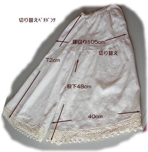 切り替えパンツ 布によってペチパンツにもなります メール便¥200又はミニ宅配便¥440のどちらかお選び下さい キット詳細 型紙、説明書 KO-34生成ドビ-布1.6m 裾5.5幅 オフホワイト麻レース 2cm幅ウエスト用ゴム72cm KO-50(\550/m)の場合 キット価格¥2450+送料 他の布でもキット組致します 布Shop |