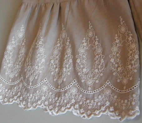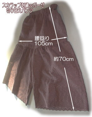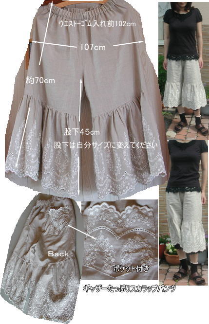 スカラップ刺繍wガーゼ 切り替えパンツ 2色あります SG-1生成 SG-2薄モカ SG-3カーキブラウン キット価格 \4500+送料 メール便¥200又はミニ宅配便¥440のどちらかお選び下さい キット詳細 型紙、説明書 Wガーゼスカラップ布(\2000/m)1.7m 2.5cm幅ウエスト用ゴム72cm |