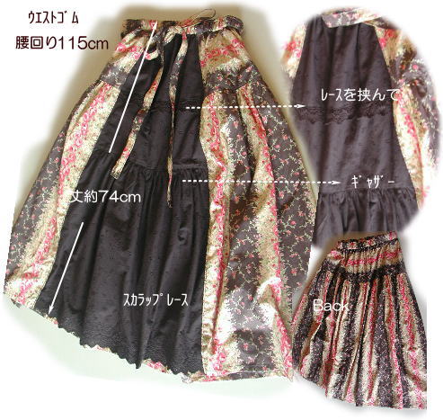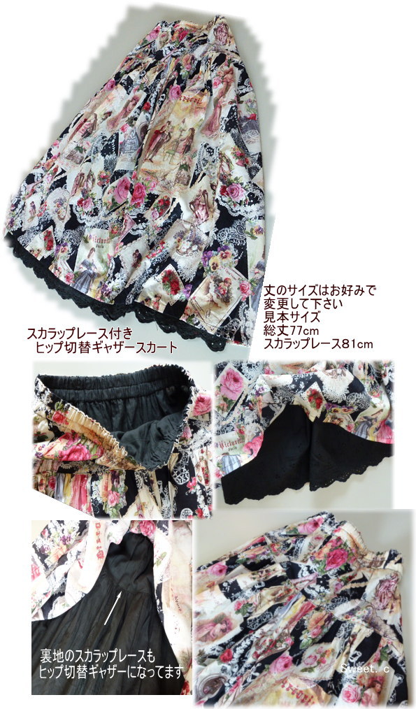 | スカラップレース付きヒップ切替ギャザースカートキット キット価格¥4500(レシピサービス)+送料 メール便200またはミニ宅配¥440 キット内容 YUWAヴィクトリアン布1.6m(¥2240)、YUWA黒ローンスカラップレース1.7m(¥2210)、ウエストゴム(\50) レシピ サービズ |