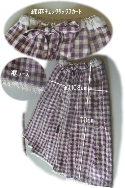 綿麻チェックタックスカート ワンサイズのみ キット価格¥2870+送料 こちらは実物サイズの型紙はありません. サイズを書いてますので 布に直接 じか裁ちしてください. 前7個後ろ7個計14のタックをとります 腰回りがすっきりしていてほっそり見えます メール便¥200又はミニ宅配便¥440のどちらかお選び下さい お好みの布をお選び下さい グレープ KO-33 焦げ茶 KO-36 ブラック KO-37 レシピ1枚、 スカート布155cm ベルト用麻布、 接着芯5x10cm 2.5cm幅ウエスト用ゴム75cm 裾用トーションレース |