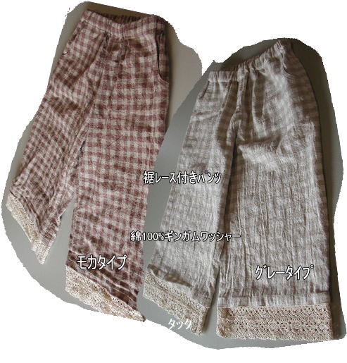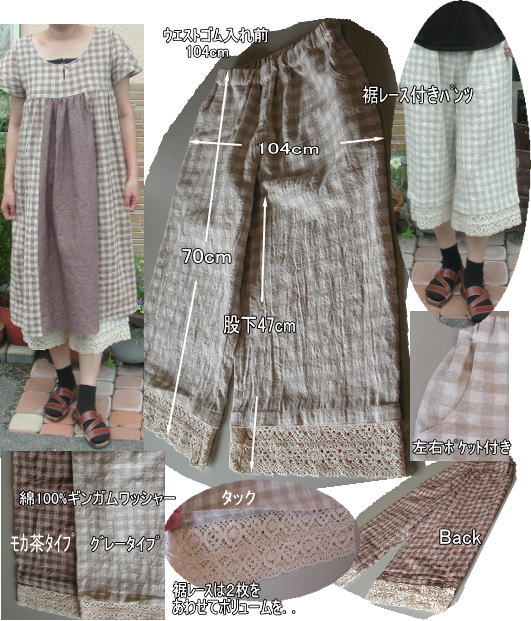 | レース付きパンツ両サイドポケット付き キット価格\3100+送料 メール便¥200又はミニ宅配便¥440のどちらかお選び下さい お好みの色タイプをお知らせください モカ茶タイプ 在庫あります グレータイプ キット内容 ギンガムチェックワッシャ加工 綿100% 108幅x165cm トーションレース2.8m 接着芯、ウエストゴム |