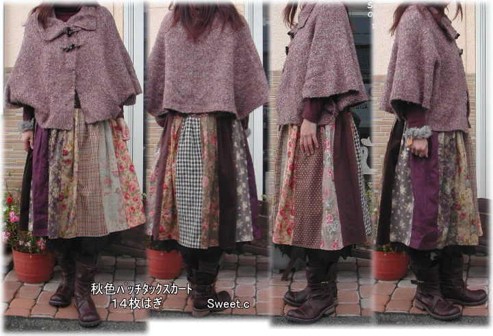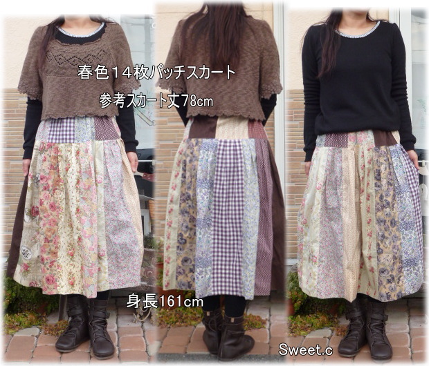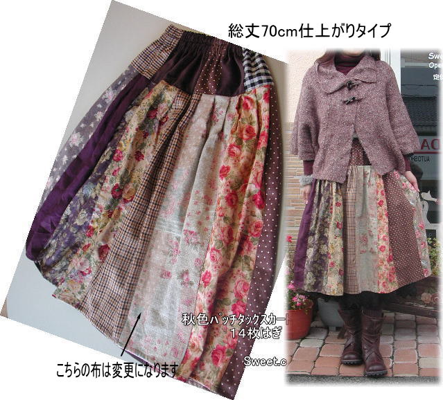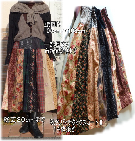 | 秋色14枚パッチ切り替えスカートキットT 総丈70cmタイプ キット価格\4800(布22枚+ウエストゴム+レシピ) +送料メール便200またはミニ宅配¥440 布は水通したものをキット組しますので すぐに縫製に取りかかれます♪ 丈はお好みに合わせて下さい 最長総丈72cm位です. 見本は総丈70cmです. |