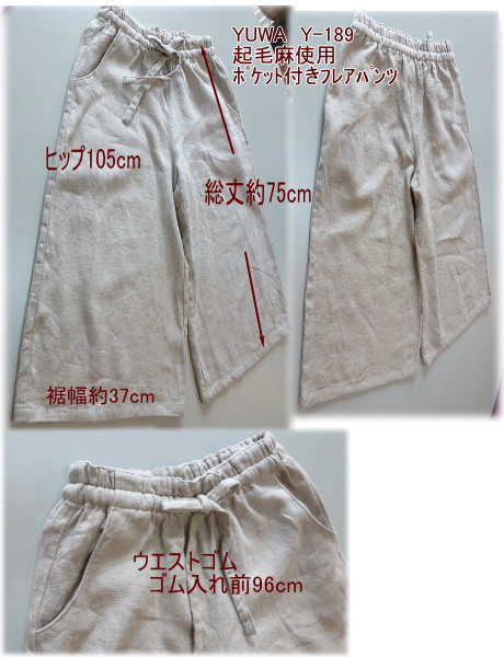 | 2ポケットフレアパンツキット ¥3950+送料 メール便200またはミニ宅配¥440 YUWA起毛麻麻 (起毛側を裏に使用します) 表側は麻のざっくり感があるパンツに仕上がります. 入っている材料 型紙レシピ、YUWA麻起毛布185cm、接着芯、ゴム |