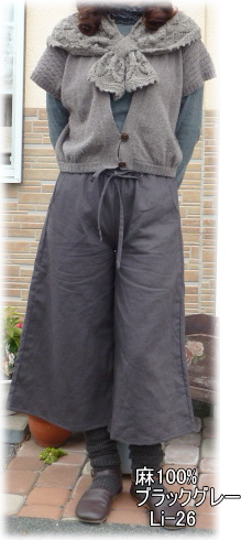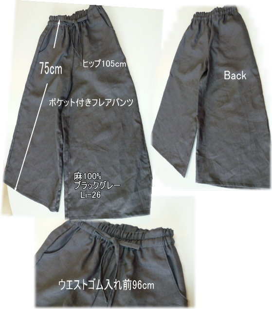 | 2ポケットフレアパンツキット 麻ブラックグレータイプ ¥3350+送料 メール便200またはミニ宅配¥440 入っている材料 型紙レシピ、麻布、接着芯、ゴム |