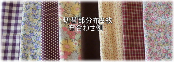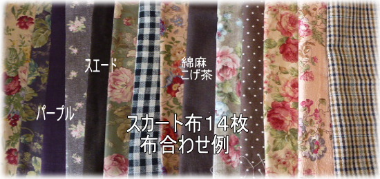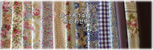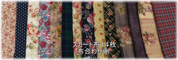 | 秋色14枚パッチ切り替えスカートキット キット価格\4920(布14枚+ウエストゴム¥4020+レシピ¥900) +送料メール便200またはミニ宅配¥440 布は水通したものをキット組しますので すぐに縫製に取りかかれます♪ キット内容 レシピ、布14種(花柄布8種、無地、チェック布6種) ウエスト用ゴム 丈はお好みに合わせて下さい 見本は総丈70cmです. |