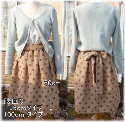| ウエストゴム ウールタックリボンスカート 裏地付き ヒップ95cm又は100cm 丈60cmです キット価格¥3900 +送料 残1セット メール便200またはミニ宅配¥440 レシピ(じか裁ち) ウール布 裏地布 接着芯 ゴム 起毛ウールドット布 キャメルベージュ 柔らかでふわっとした薄地ウール布です ウール70% ポリエステル20% アクリル5% ナイロン5% 裏地布 ポリエステル100% お洗濯可能 帯電防止加工品 透け防止性能 おしゃれ着洗いの洗剤で手洗いをお勧めします. (洗濯機でネットに入れて手洗いコースでも可) |