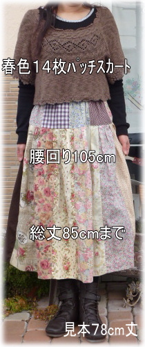 | 春色14枚パッチ切り替えスカートキット 総丈85cmタイプ (丈はお好みに合わせて仕上げて下さい) キット価格\4700(布22枚+ウエストゴム+レシピ) +送料メール便200またはミニ宅配¥440 布は水通したものをキット組しますので すぐに縫製に取りかかれます♪ 見本は総丈78cmです |