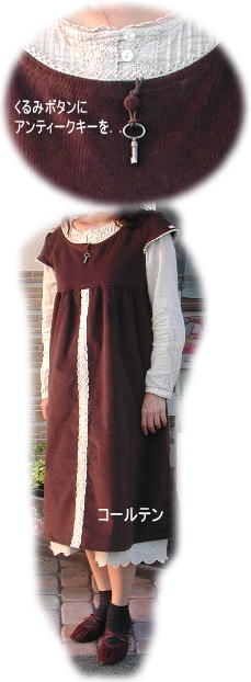 110cm幅の布の場合200cm必要 コールテン布 KL−4のコールテン茶の場合 (\880/m)の布代\1760 +1300(型紙、レース) 合計¥3060 袖口のレース、前スカートのレース アンティークキー、くるみボタンは キットには含まれません. 別売り レースは注文受付いたします. 3.4cm幅トーションレース (\280/m) 100cm ¥280 袖口トーション (\120/m)60cm ¥70 ![]() 1本 ¥580 |