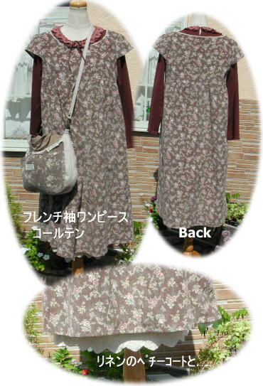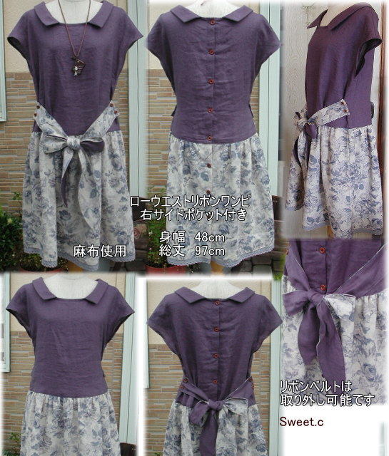 | ローウエスト切り替えワンピキット (定価\6190)→キット価格¥5900+送料 7/29 メール便¥200又はミニ宅配便 ¥440のどちらかお選び下さい 入っている材料 麻無地Li-22 グレーパープル(¥1580/m)135cm幅 1.1m(\1740) YUWA麻 バラ花柄布(参考価格¥3150/m→\2600/m)140cm幅 1.1m(¥2860) 接着芯\50、 トーションレース2m(¥440) 型紙レシピ (\1100) ボタンは別売りになります ボタンセット ¥350 15mm9個 11.5mm4個 ![]() 他の布でもキット組は可能です♪ |