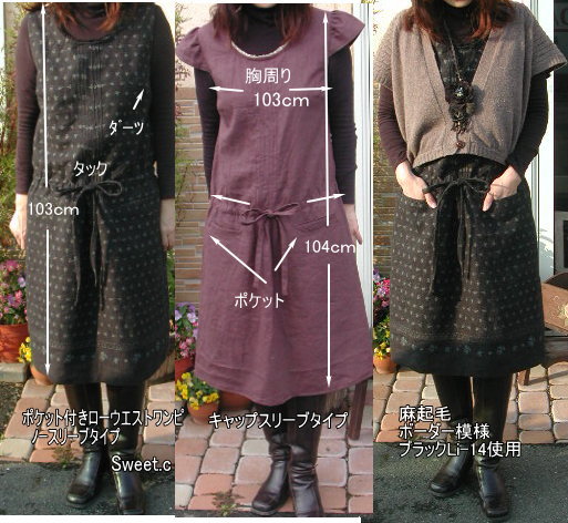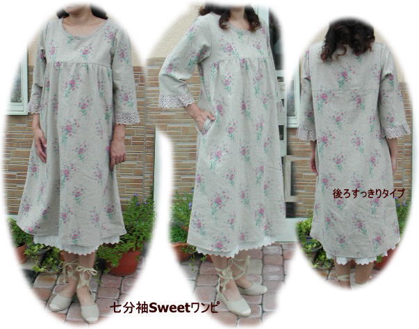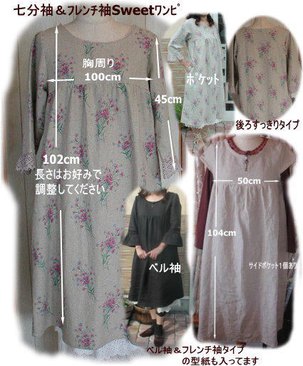 | 後ろすっきりワンピ ポケット付き 七分袖&フレンチ袖型紙入り ベル袖型紙も追加で書き込みしました..(2007.10.30) 1サイズのみです. 下に重ね着出来るようにゆったりサイズです 型紙はA3サイズコピー用紙です (実物大型紙+作り方説明書 計11枚 張り合わせて作って頂きます) キット内容 布、YUWA麻100%グレーレース 2種(衿用レース、七分袖用レース) 接着心、型紙レシピ 布Shopにあるお好みの布でキット組ができます 140〜148cm幅の布の場合 1.8m(ベル袖タイプはぎりぎりで製作可能) 130〜138幅の場合 2m 110cm幅の場合−七分袖2.5m ベル袖タイプは2.6m必要 布Shop キット価格 お好みの布代+¥1750(型紙レシピ、レース2種、接着芯) 注文方法 お好みの布を必ずお知らせ下さい. |