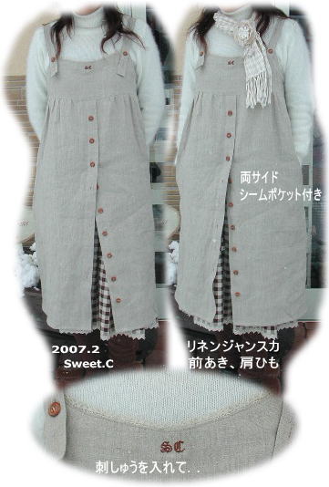 ジャンバースカートキット ワンサイズのみです リネンタイプ(LI−21ナチュラル無地\1480/m) ) (135cm幅以上の場合1.8m必要) キット価格¥4010+送料 メール便¥200又はミニ宅配便¥440の どちらかお選び下さい 他の布でもキット組出来ます. *キットにはボタン11個は入ってません お好みのボタンをご用意下さい 貝ボタンでも可愛いです. ブロックチェック茶色 ゚KO−17(麻20%混)タイフ 完売 グレープ綿麻ブロックの場合(麻50%混) KO-33 (108cm幅の場合2.1m必要) キット価格¥3410+送料 グレープチェック布980x2.1m ¥2060 型紙、レシピ、接着芯、トーションレース ¥1350 *キットにはボタン11個は入ってません お好みのボタンをご用意下さい 貝ボタンでも可愛いです. ボタンを開けてスカートを覗かせても可愛いです 肩ひもに2個のボタンホールを開けます. 両サイドポケット付です. 簡単な作業でポケットも出来ます. 身頃のSCの刺しゅうはキット布にはありません.. |