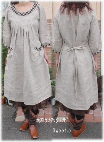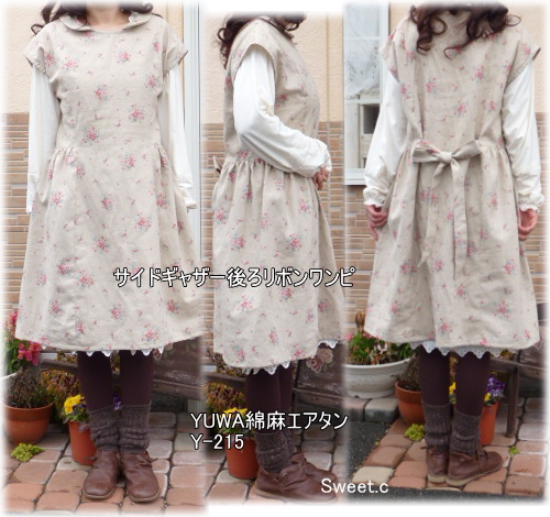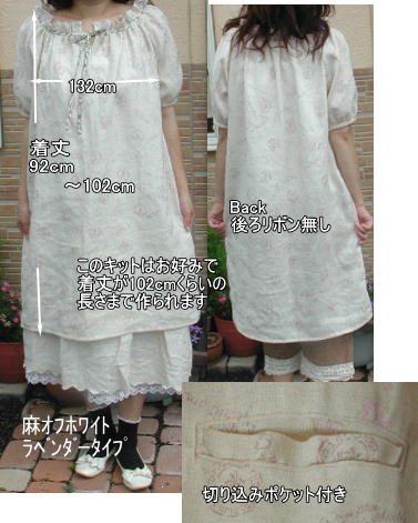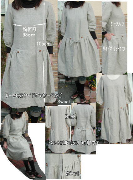 ローウエストギャザーワンピ サイドポッケ1個付き キット価格¥4680+送料 メール便¥200又はミニ宅配便 ¥440のどちらかお選び下さい キット内容 型紙、レシピ 布麻Li−20 135幅 215cm (Li-16の麻タイプは完売) 襟用レース ボタン4個 接着芯 指定の麻が完売の場合 在庫のある布でキット組致します KO-40タイプの場合 108cm幅x2.9m キット価格¥4300+送料 (*袖は麻タイプになります.) ![]() |