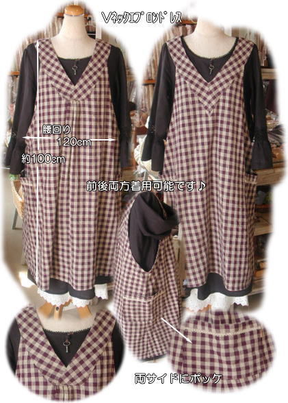 Vネックエプロンドレス お好みの布をお選び下さい 綿麻ブロックチェックKO-33グレープチェック 又は KO-36焦げ茶 又は KO-37ブラック キット価格¥3750+送料 メール便¥200又はミニ宅配便¥430のどちらかお選び下さい キット内容 108cm幅 布2.5m ポケット用トーションレース 型紙、説明書 ご用意して頂くもの 薄手接着芯40x25cm |