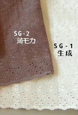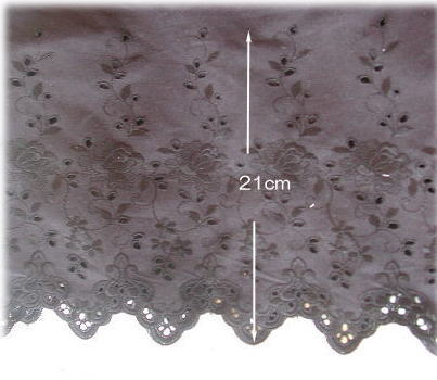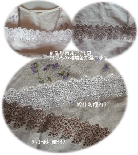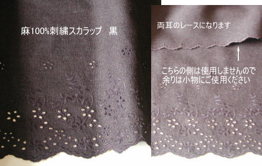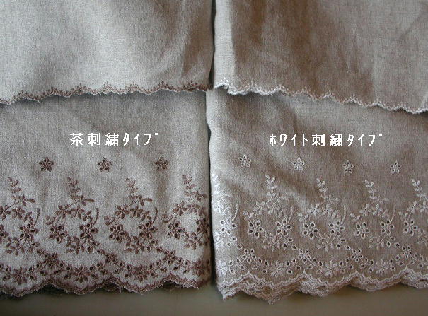 ![]() 画像の見本は綿100%のスカラップレースですが キット布は 本体布(麻100%)に合わせ下記のリネンスカラップ布になります. こちらはすその刺繍のみで 全体には刺繍は入ってません. ![]() |
