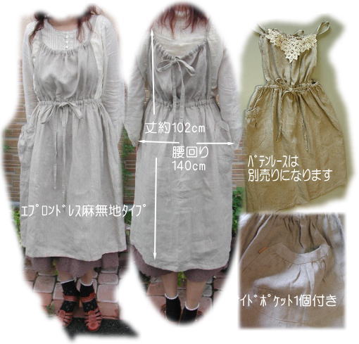 麻無地 エプロンドレスキット バテンレース無し キット価格\3200 +送料 バテンレースは別にご注文下さい 見本の生成りは完売しました 下記からお選びください ベージュ¥420 白¥500 ![]() メール便¥200又はミニ宅配便 ¥440のどちらかお選び下さい キット内容 型紙.レシピ ポケット、身頃は実物大型紙 スカートはサイズが書いてます 麻無地布 ゴム、接着芯 |