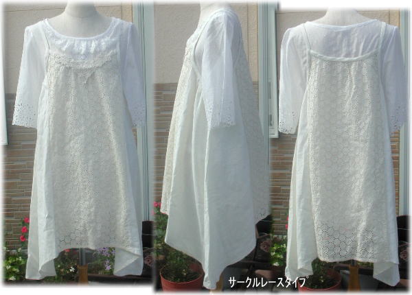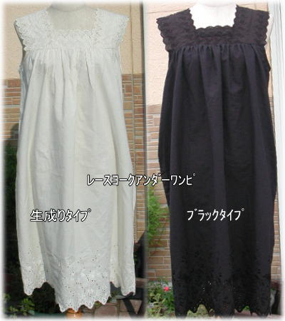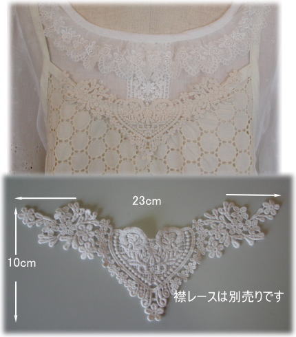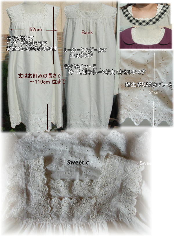 | レースヨークアンダーワンピキット 生成りタイプ キット価格\3600+送料 メール便¥200又はミニ宅配便 ¥440のどちらかお選び下さい ワンピのインナーにご着用下さい.. 衿口や裾からレースがのぞいてカワイイです. キット内容 型紙、レシピ、 綿100%スカラップレース布、生成り綿刺繍レース |