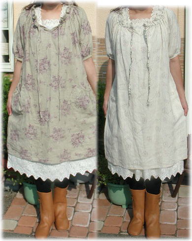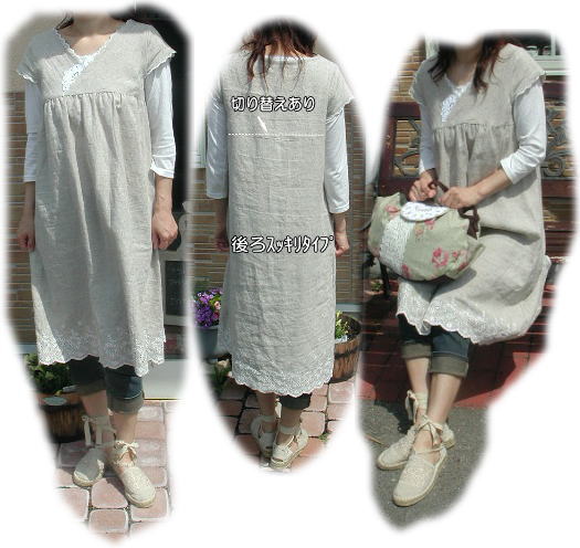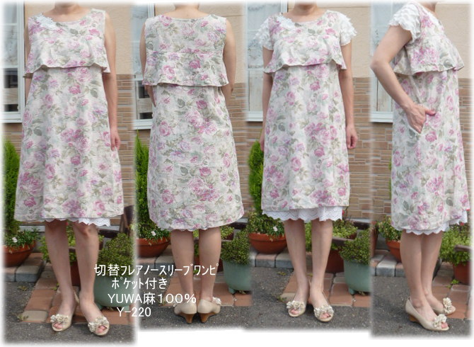 | 切替フレアノースリーブワンピポケット付きキット YUWA麻100%バラ布タイプ 布が選べます. ピンクタイプ(Y-220) 藍色タイプ(Y-221) キット価格 \5420+送料 入っている材料 型紙レシピ、麻バラ布140cm巾x170cm( 布代参考価格 定価¥3150/mx1.7m \5355) ポケット用伸び止めテープ、飾りモチーフレース |