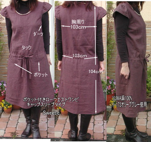 ポケット付ローウエストタックワンピースキット YUWA麻タイプキット¥4300+送料 メール便¥200又はミニ宅配便 ¥440のどちらかお選び下さい YUWA麻布タイプ 140cm巾以上をお選びください お勧め布は Y-195パープル Y-196焦げ茶 Y-159 黒 Y-149カーキ ゙ Y-172オリーブグレー、 Y-158オリーフは 完売しました. ノースリーブまたはキャップスリーブタイプが作れます. おまけとして七部袖の型紙も 付けてます. (七部袖の場合布が50cmプラス必要です) キット内容 型紙、レシピ 布 トーションレース 接着芯 |