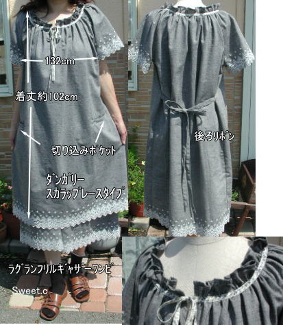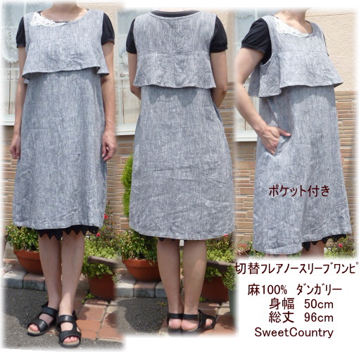 | 切替フレアノースリーブワンピポケット付きキット ダンガリータイプ キット価格 \3600+送料 入っている材料 型紙レシピ、麻ダンガリー布140cm巾x170cm ポケット用伸び止めテープ、飾りモチーフレース |