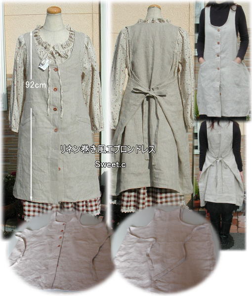 | リネン巻き風エプロンドレス ポケット付きキット ナチュラル麻タイプLi-20 \3700+送料 メール便¥200又はミニ宅配便 ¥440のどちらかお選び下さい 用意していただくもの 1.5cmボタン6個 キット内容 型紙レシピ、麻布135cm幅x200cm、接着芯(前立て用、ポケット用) |