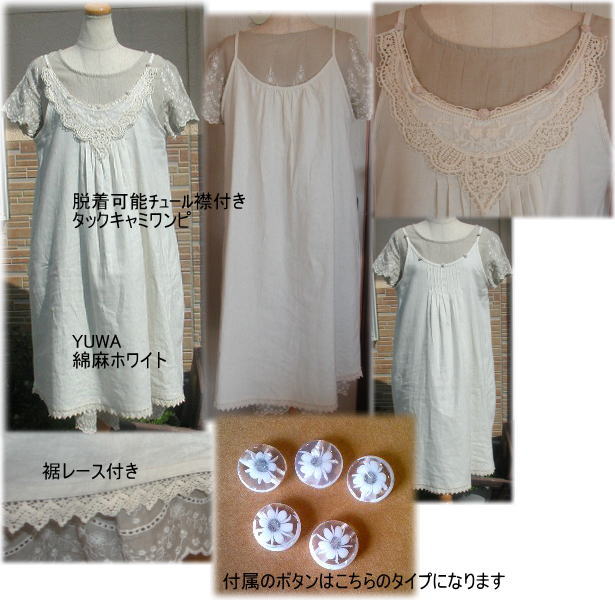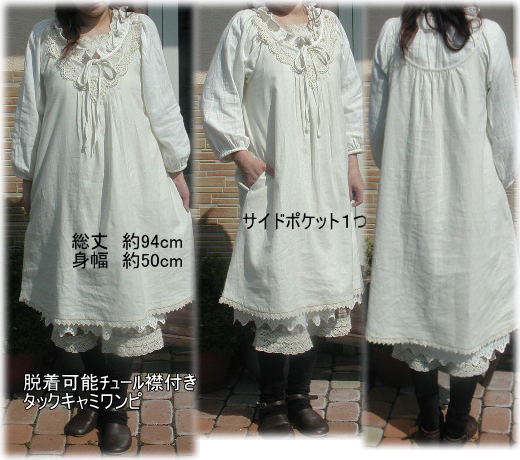 | チュールレース付きキャミワンピ キット サイドポケット1 ¥4300+送料 メール便¥200又はミニ宅配便 ¥440のどちらかお選び下さい キット内容 YUWA綿麻ホワイト布148幅X200cm、チュールレース襟1枚 裾用トーションレース200cm、ボタン5個、ポケット用テープ |