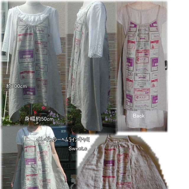 | イレギュラーヘムラインキャミキット エッフェルモチーフキット ¥3950+送料 メール便¥200又は ミニ宅配便¥440のどちらかお選び下さい 入っている材料 材料 麻無地(1480/m) 90cmx135幅¥1330 綿麻エッフェルモチーフ布(1900/m) 80x140幅¥1520 型紙レシヒ\|1100 エッフェルモチーフ布は お好みの柄を使用して頂くため 多めに入ってます. 柄を考えなければ残りで もう1枚このキャミが作れます. 見本画像は総丈90cmですが キットの方は10cmほど長くしてますので 総丈は100cm位になります. |
