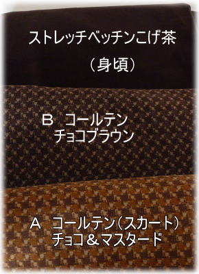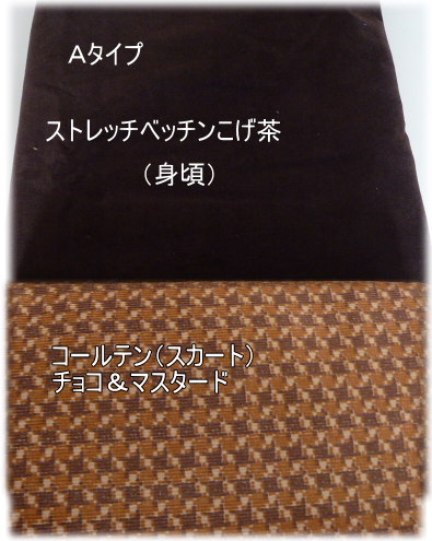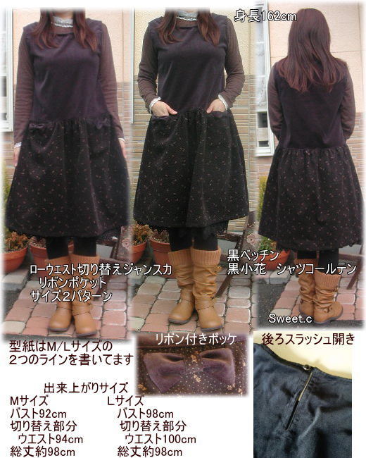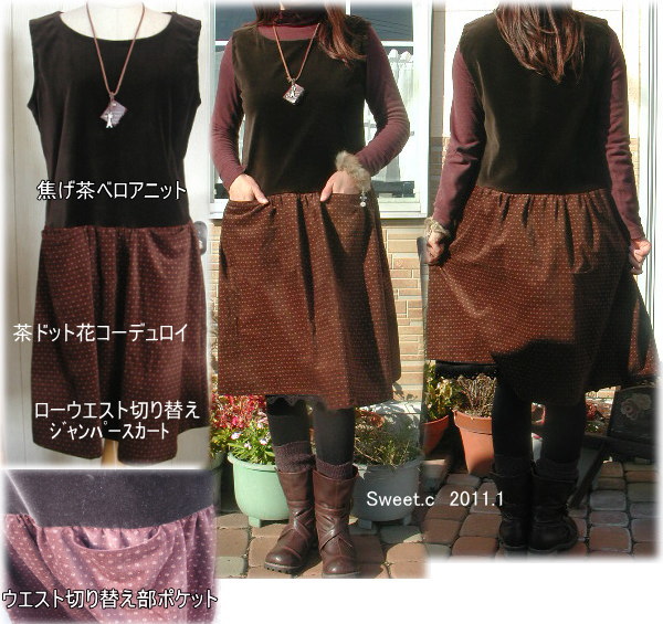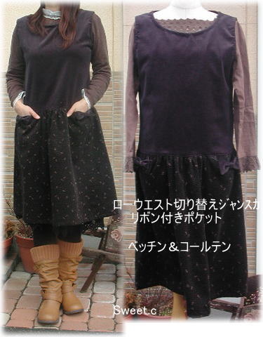 | ローウエスト切り替えジャンパースカートキット \3680+送料 こげ茶ベッチン&コールテン M/Lサイズ 2012.11.6追加再販しました Aタイプ Bタイプ メール便¥200又は ミニ宅配便¥440のどちらかお選び下さい 入ってる材料 型紙、レシピ、ベッチン布 シャツコールテン 接着芯、ボタン1個 |