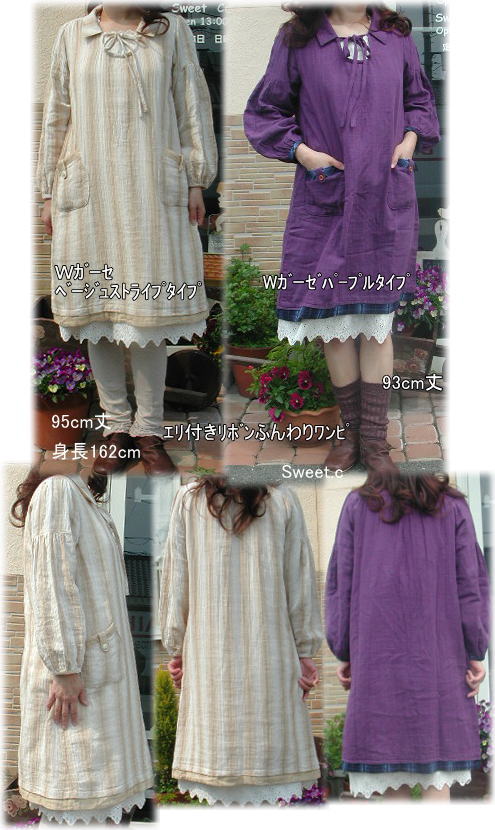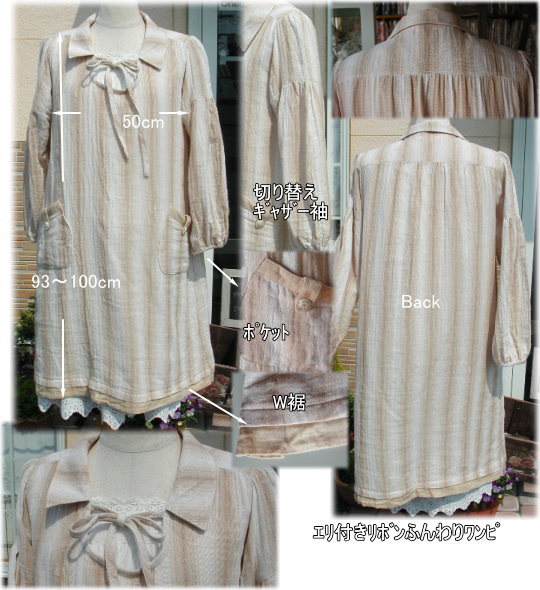 | エリ付きリボンふんわりワンピキット wガーゼベージュストライプタイプ キット価格¥4200 1サイズのみ 丈は100cmまで作れます メール便¥200又は ミニ宅配便¥440のどちらかお選び下さい このキットは布の厚さがありますので1セットのみメール便可能です 入っている材料 型紙、レシピWガーゼベージュ布3m、 接着芯、ボタン2個 布セット価格(型紙無しタイプ) \3200 |