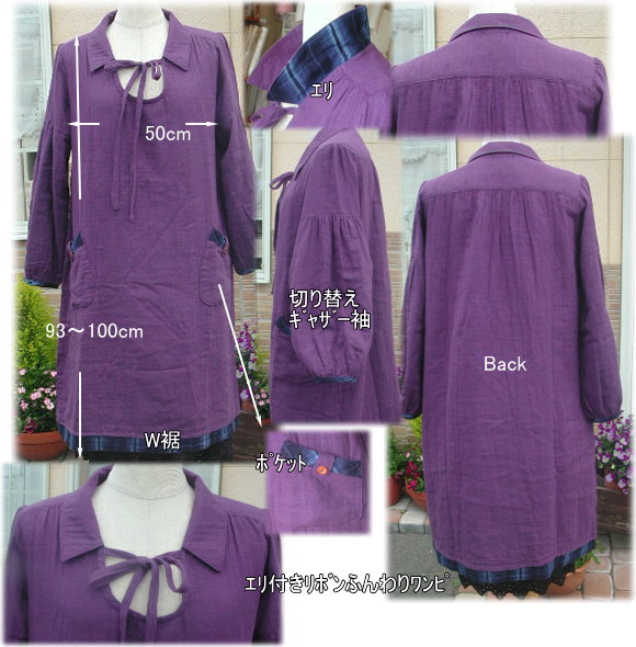 | エリ付きリボンふんわりワンピキット wガーゼパープル゚タイプ キット価格¥4200+送料 残2セット 1サイズのみ 丈は100cmまで作れます メール便¥200又は ミニ宅配便¥440のどちらかお選び下さい のキットは布の厚さがありますので1セットのみメール便可能です 入ってる材料 型紙、レシピ、Wガーゼリバーシブルパープル布3m、 接着芯、ボタン2個 布セット価格 (型紙無しタイプ) \3200 |