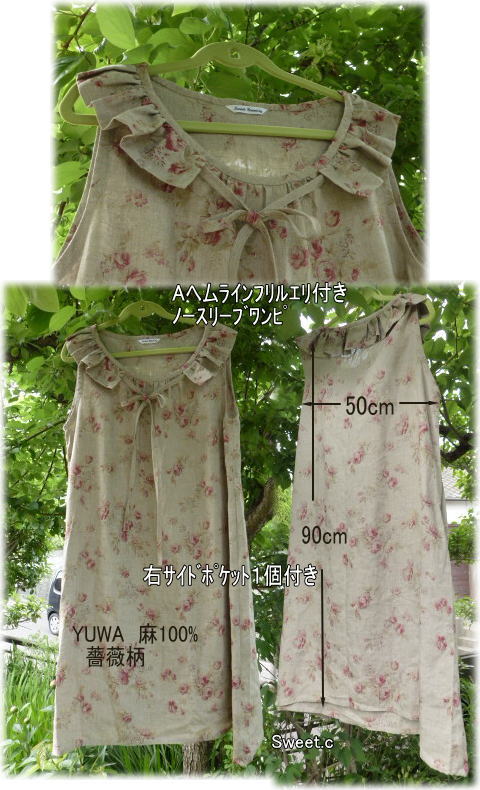 | Aヘムラインフリル襟付きノースリーブワンピキット \4780 YUWA麻Y-231 レッドバラ柄タイプ Y-232パープルバラ柄もキット組可能です キット内容 (型紙、レシピ、麻バラ布2.1m、接着テ-プ) 布セット\3780(型紙レシピ無し) |