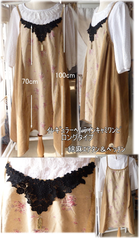 | イレギュラーヘムラインキャミキットロング冬バージョン ¥3760 A薄らくだ色ベージュベッチンタイプ 入っている材料 YUWA綿麻エアタン(1700/m) 85x70cm幅 ¥720 ベッチン (\1080/m)180x108cm幅 \1940 型紙レシピ \1100 別売り 黒襟レース&カニカン付きチャーム¥550 ABCタイプ あります. 前回キットをご購入の方はレースのみの販売も可能です♪ |