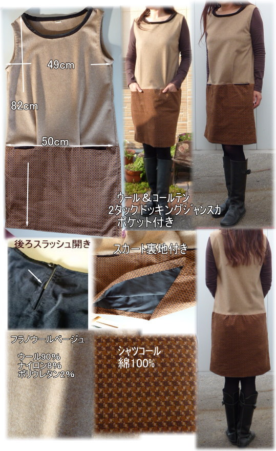 | 2タックドッキングジャンスカキット ポケット付き キット価格¥3750 メール便¥200又はミニ宅配便 ¥440のどちらかお選び下さい キット内容 型紙、レシピ、身頃用ウール布、スカート用コールテン、スカート用裏地布 エリ用ストレッチベッチン、ポケット布、ボタン1個、接着芯 *見本には衿口に後ろ開きはありませんが キットにはスラッシュ開きをつけてます.. 厚さもちょうど良く 縫製しやすい布です♪ 私はスチームアイロンでシワを整え水通ししないで縫製しました. 完成後 ネットに入れて自宅で洗濯してみました. ウールがとっても柔らかくしなやかになります. あまり縮みも感じませんでした. |
