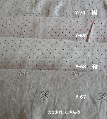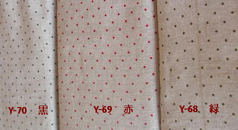 | 麻100% ドット 110cm幅 Y-68 深緑 Y-69 赤 Y-70 黒 (T.1800円(1890)/m) 各¥1680/m (税込み1760/m) |