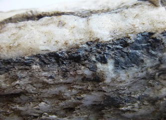 組成式FeTiO3のチタン鉄鉱でした。金紅石(ルチル)や紅簾石(ピーモンタイト)と同じく、眉山を代表する銘柄標本です。ルチルが有名すぎてその陰に隠れていますが、残存する標本数はルチルより少ないです。私としては3例目ですが、うちの仲間でも採取できたのは2人だけです。何度も探しに行っているけれど少ないです。