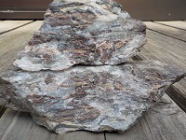 6個目を割ったとき断面に板状の鉱物が含まれていました。灰黒色で金属光沢があり、高越山や関川でときどき見かけるチタン鉄鉱です。昭和40年代の保育社発刊の鉱物図鑑には、眉山のルチルとともにこの鉱物が掲載されています。言うなれば銘柄標本であった訳ですが、これの産地はまったく知られておらず、ルチル以上に産地不明の鉱物でした(ルチルの産地は知られていますが、現在は某病院のコンクリのよう壁に埋もれています。)。